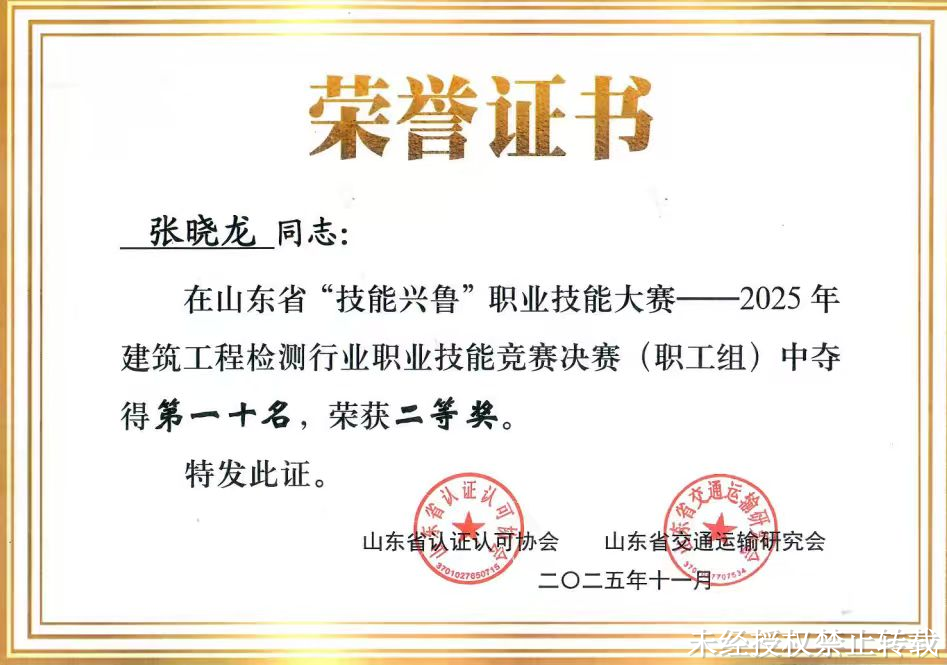近日,2025年山東省“技能興魯”建筑工程檢測行業(yè)職業(yè)技能競賽落幕。山東交建集團代表隊斬獲職工組團體一等獎,1人榮獲個人一等獎,1人榮獲個人二等獎。