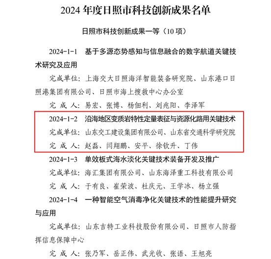 近日,日照市政府公布了“2024年度日照市科技創(chuàng)新成果”名單。山東交工建設(shè)集團(tuán)“沿海地區(qū)變質(zhì)巖特性定量表征與資源化路用關(guān)鍵技術(shù)”獲得科創(chuàng)成果一等。