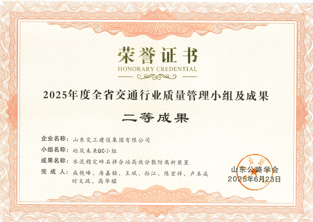 近日,山東公路學(xué)會公布了2025年全省交通行業(yè)質(zhì)量管理小組及質(zhì)量信得過班組評選結(jié)果,山東交建集團申報的“QC小組”榮獲4項大獎,展現(xiàn)了公司在工程質(zhì)量管理方面的創(chuàng)新實力和技術(shù)水平。